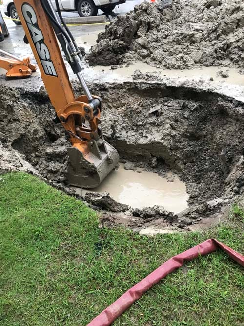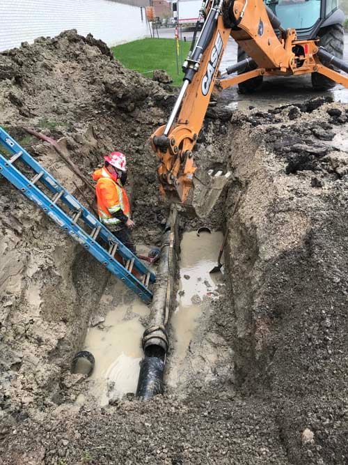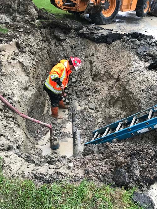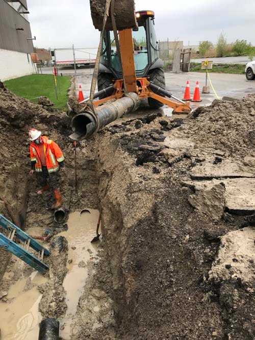 Promain returned to site with Hydro excavator. Once the area was free and clear, technicians cut and secured the deteriorated pipe for removal. Upon removal of the pipe, granular stone was added to support and protect the new section of PVC piping.