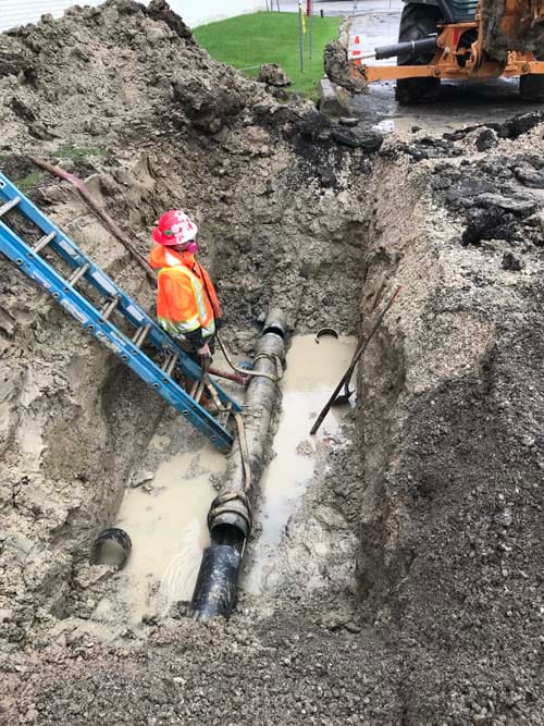 Scans revealed an existing water line for the fire sprinkler system. Due to the sensitive dig area, Promain enlisted a hydro excavation truck to expose the underground piping. Promain found a slow leak and, at the request of the client, attempted to make a budget-friendly localized repair using a saddle. Due to the age of the pipe, further repairs were required.